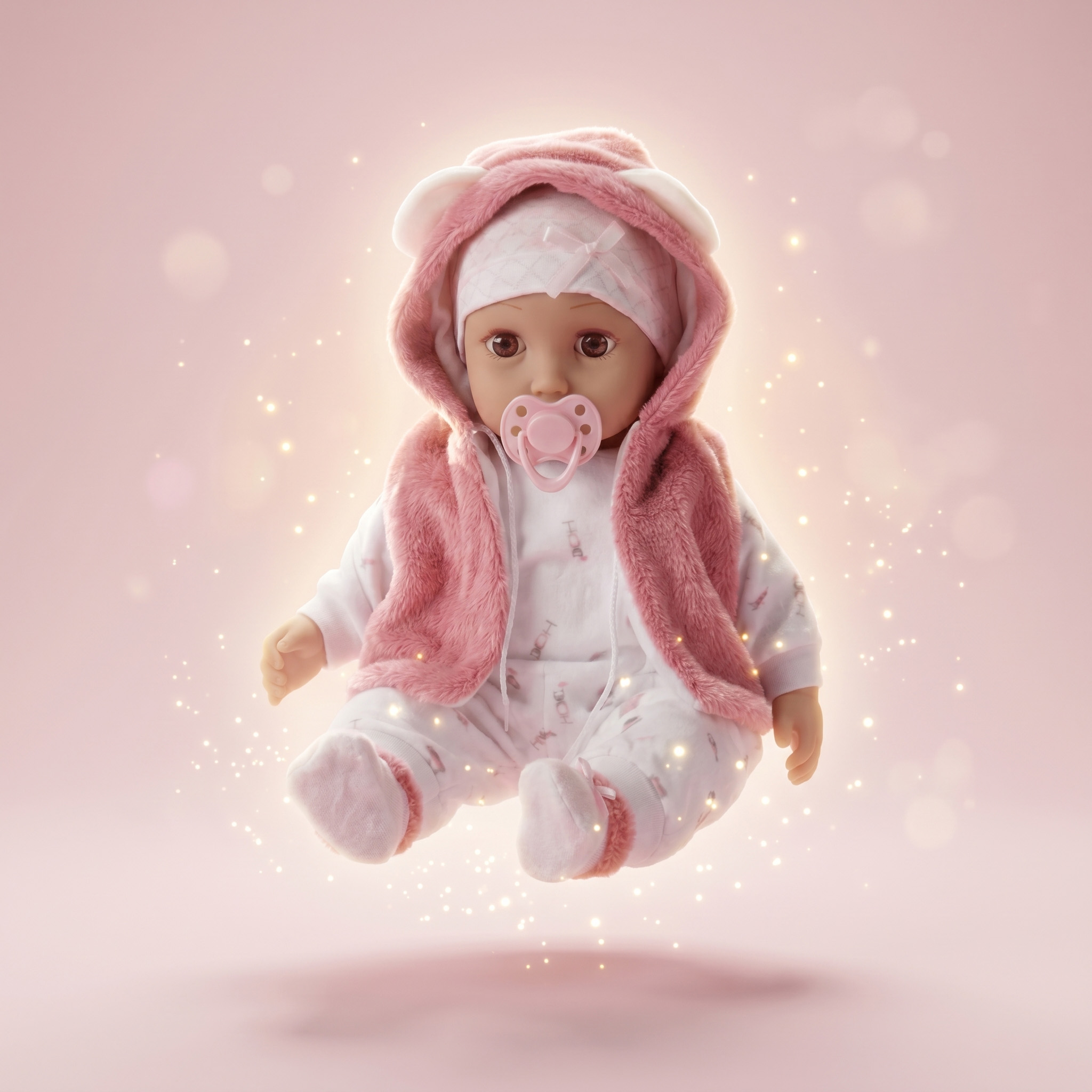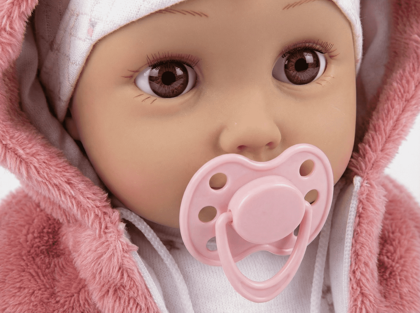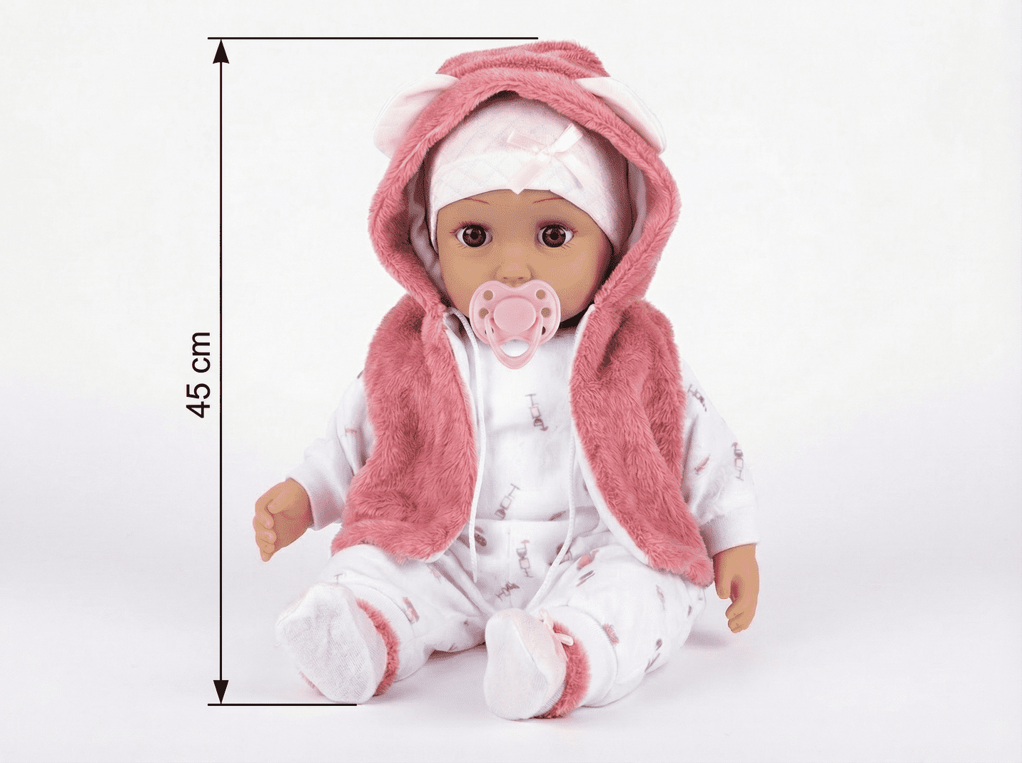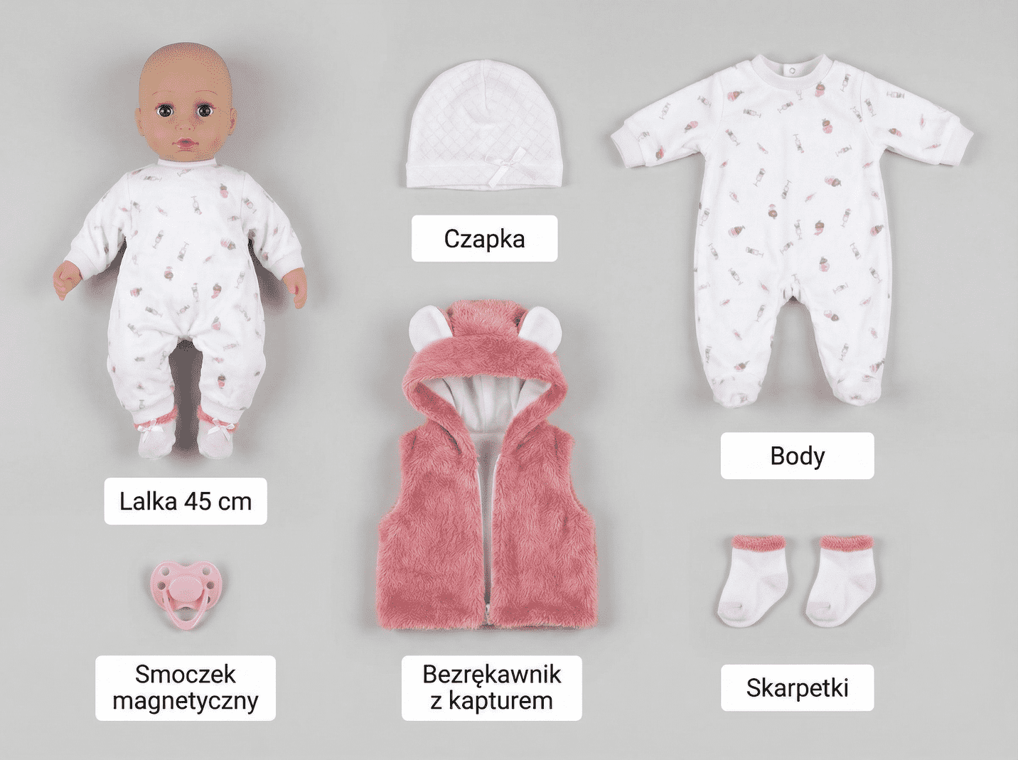 Lalka po naciśnięciu na brzuszek mówi i śpiewa po polsku – aż 9 zwrotów oraz 4 znane dziecięce piosenki. W zestawie znajduje się magnetyczny smoczek, miękka czapeczka, body, skarpetki oraz puszysty bezrękawnik z kapturem. Całość tworzy kompletny, gotowy do zabawy zestaw, który angażuje zmysły i wyobraźnię dziecka.