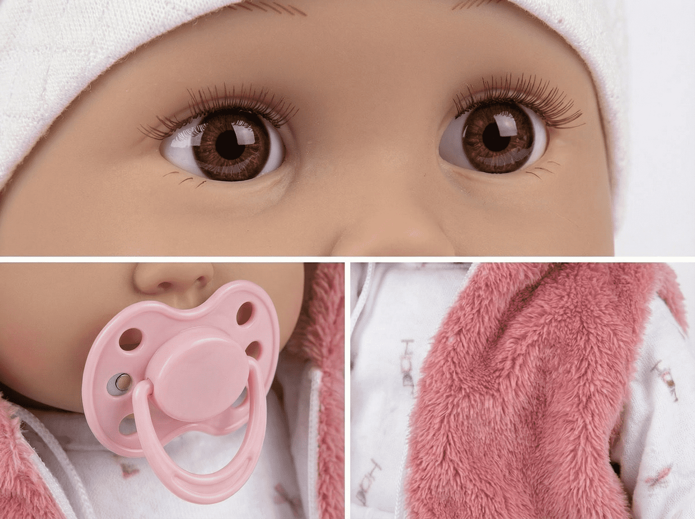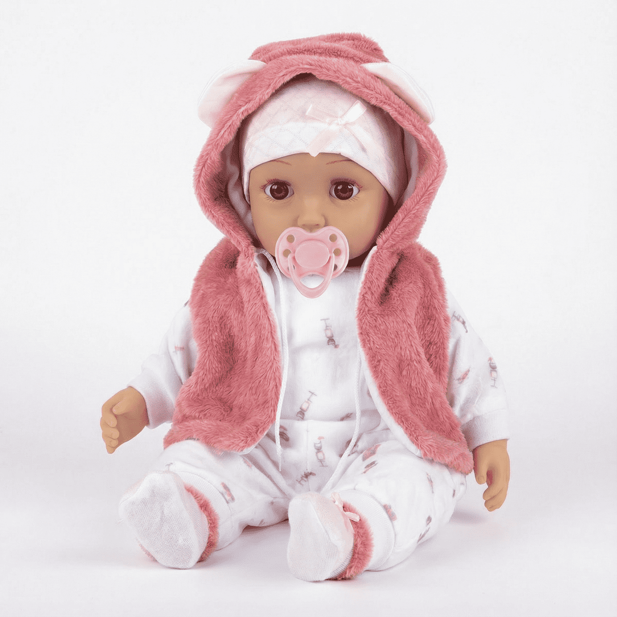 Już pierwszy rzut oka na tę uroczą laleczkę wywołuje uśmiech. Jej duże, otwarte oczka, mięciutkie ubranko i elegancki bezrękawnik tworzą obraz prawdziwego bobaska, którego aż chce się przytulić. Naturalne proporcje i słodka mina sprawiają, że wygląda niczym żywa, zachęcając do opieki i zabawy.