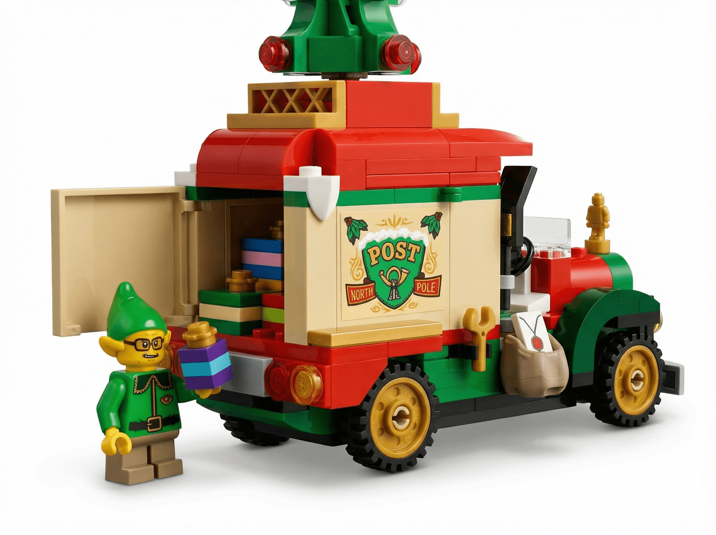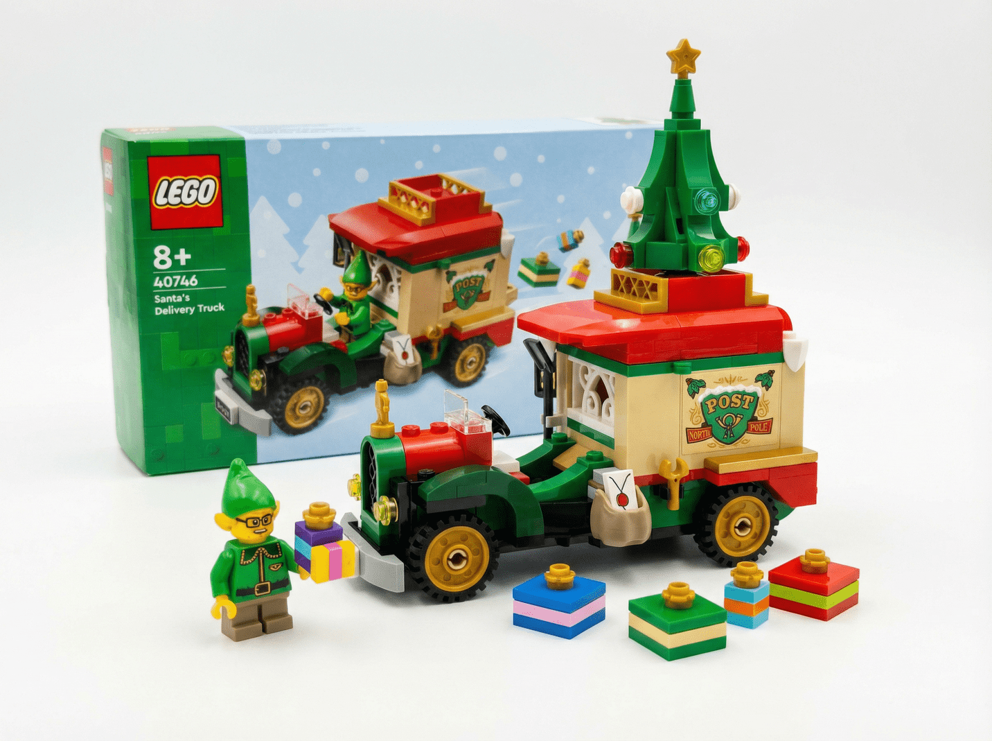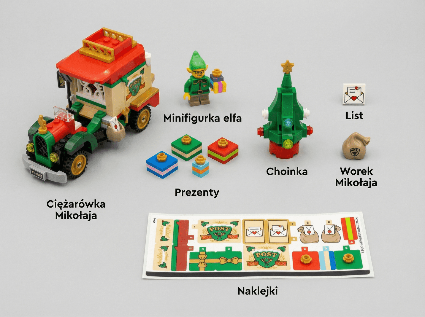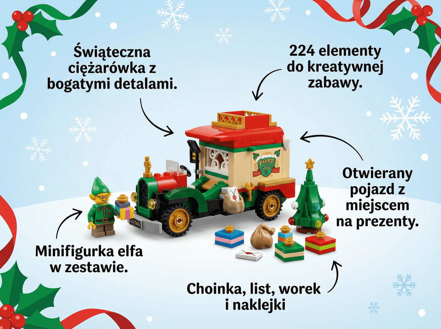 Zestaw LEGO składa się z 224 elementów i oferuje mnóstwo funkcji, które rozwijają wyobraźnię. Otwierana ciężarówka kryje w środku prezenty oraz małą choinkę LEGO, którą można umieścić na dachu pojazdu. Do kompletu dołączono również list, worek Mikołaja i naklejki do dekoracji. Minifigurka elfa może prowadzić ciężarówkę, inspirując do świątecznych misji dostarczania prezentów.